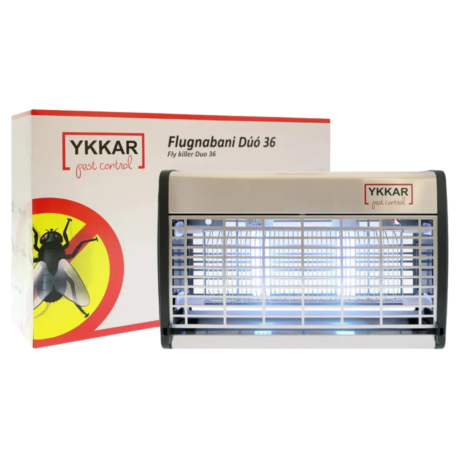 Flugnabani Dúó 36 er öflugt og stílhreint tæki sem hannað er til að vernda stór rými gegn flugum og öðrum fljúgandi skordýrum. Hann er framleiddur úr ryðfríu stáli og endingargóðu ABS plasti sem tryggir bæði styrk og langan líftíma. Tækið er búið tveimur Actalite 18W perum sem gefa frá sér UV-ljós til að laða að skordýr og stórt safnbakka- og límspjaldakerfi sem fangar þau á áhrifaríkan hátt. Með verndarsvæði allt að 140 m² er Dúó 36 fullkominn kostur fyrir heimili, veitingastaði, kaffihús, matvælavinnslu og aðra staði þar sem hreinlæti skiptir miklu máli.