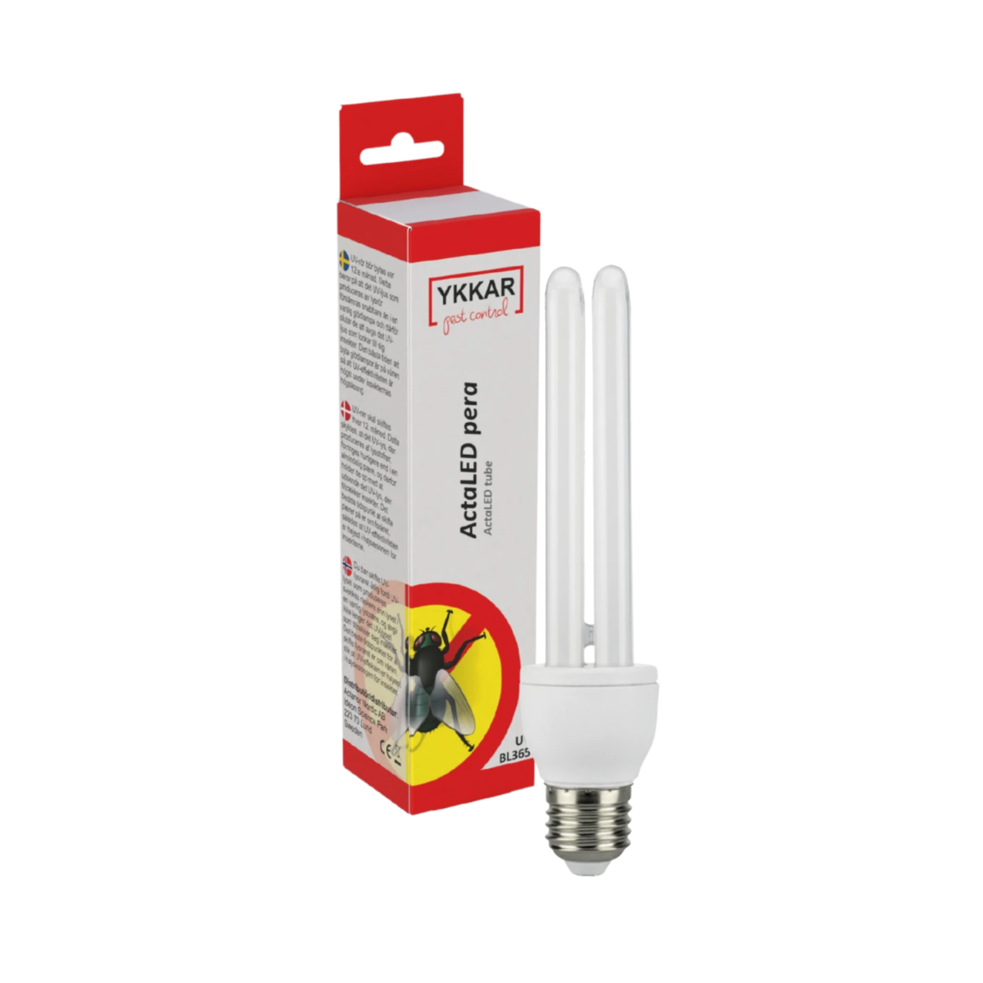 Ykkar ActaLED peran er góð LED-UV pera sem hönnuð er til að laða að fljúgandi skordýr í flugnabönum og gildrum frá Ykkar. Hún gefur frá sér útfjólublátt ljós sem dregur að flugur á áhrifaríkan hátt og tryggir hámarksvirkni flugnabana. LED tæknin gerir peruna orkusparandi og endingargóða, sem dregur úr viðhaldsþörf og rekstrarkostnaði. Hentar bæði á heimilum og vinnustöðum þar sem þörf er á hreinlæti og skordýralausu umhverfi.
